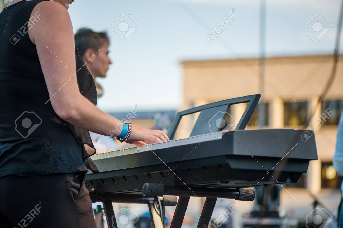男性ミュージシャンが舞台で楽器を演奏します キーボードシンセサイザーピアノキーで演奏アーティスト 夏祭りの夜の合唱音楽のライブコンサート カラフルで抽象的なライト の写真素材 画像素材 Image 92683691