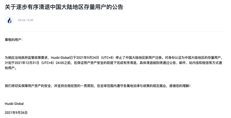 火币全球站称将在年内清退中国大陆用户 已停止大陆新用户注册 此前将部分雇员迁至新加坡 蓝鲸财经